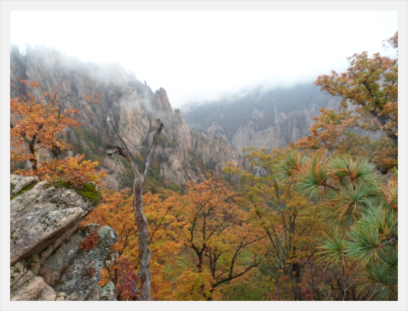 끝청쯤에 날이 밝았고 대청봉과 주위의 산들은 조망이 허락되지 않아 못내 아쉬웠다 회운각쯤 내려오니 주위의 산들이 보이기 시작 천태만상의 기암과 거대한 암봉 암릉은 천고의 수림과 더불어 조화를 이루며 계절따라 변모하는 아름다움은 설악의 극치 이기도 하다